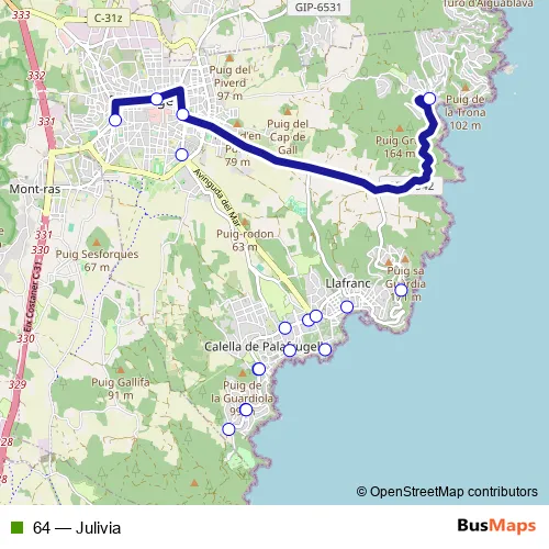 See why over 2 million users trust and consider busmaps.com as the best public transport website. busmaps gives you Palafrugell Buses suggested routes, real-time bus tracker, line route maps in Palafrugell, and helps to find the closest 64 bus stops near you. No internet available? Download an offline PDF map and bus schedule for the 64 bus to take on your trip.
