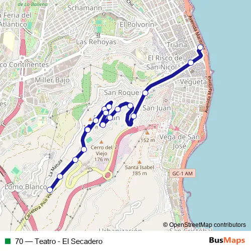 See why over 2 million users trust and consider busmaps.com as the best public transport website. busmaps gives you Las Palmas de Gran Canaria Buses suggested routes, real-time bus tracker, line route maps in Las Palmas de Gran Canaria, and helps to find the closest 70 bus stops near you. No internet available? Download an offline PDF map and bus schedule for the 70 bus to take on your trip.