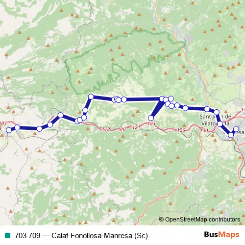 The first stop of the 703 709 bus route is pg. Santa Calamanda (Estació Renfe) (D) and the last stop is Manresa (estació d'autobusos). 703 709 (Calaf-Fonollosa-Manresa (Sc)) is operational during cada dia.