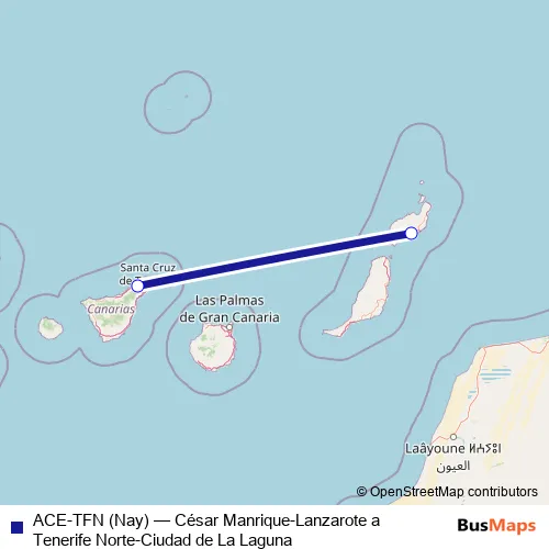 The first stop of the ACE-TFN (Nay) air route is Aeropuerto César Manrique-Lanzarote and the last stop is Aeropuerto Tenerife Norte-Ciudad de La Laguna. ACE-TFN (Nay) (César Manrique-Lanzarote a Tenerife Norte-Ciudad de La Laguna) is operational during cada dia.