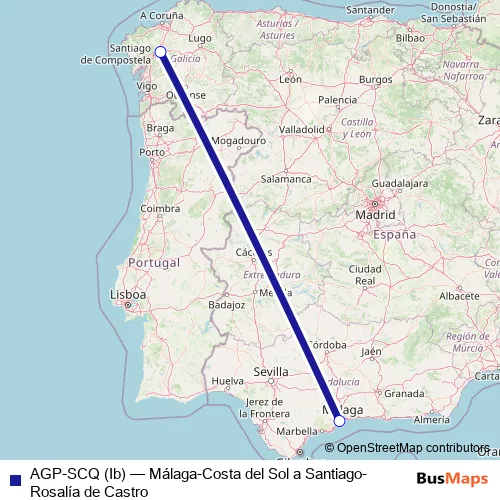 The first stop of the AGP-SCQ (Ib) air route is Aeropuerto Málaga-Costa del Sol and the last stop is Aeropuerto Santiago-Rosalía de Castro. AGP-SCQ (Ib) (Málaga-Costa del Sol a Santiago-Rosalía de Castro) is operational during cada dia.