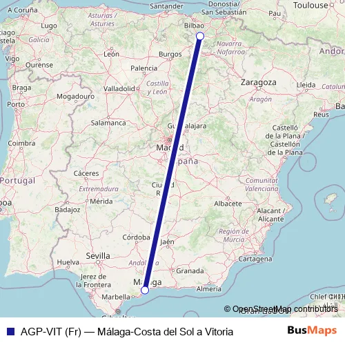 The first stop of the AGP-VIT (Fr) air route is Aeropuerto Málaga-Costa del Sol and the last stop is Aeropuerto Vitoria. AGP-VIT (Fr) (Málaga-Costa del Sol a Vitoria) is operational during cada dia.