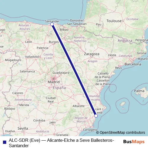 See why over 2 million users trust and consider busmaps.com as the best public transport website. busmaps gives you Santander Flights suggested routes, real-time bus tracker, line route maps in Santander, and helps to find the closest ALC-SDR (Eve) air stops near you. No internet available? Download an offline PDF map and bus schedule for the ALC-SDR (Eve) air to take on your trip.
