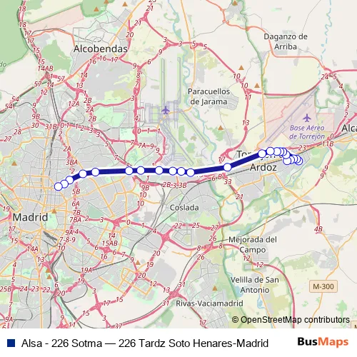 See why over 2 million users trust and consider busmaps.com as the best public transport website. busmaps gives you Torrejon de Ardoz Buses suggested routes, real-time bus tracker, line route maps in Torrejon de Ardoz, and helps to find the closest Alsa - 226 Sotma bus stops near you. No internet available? Download an offline PDF map and bus schedule for the Alsa - 226 Sotma bus to take on your trip.