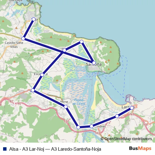 The first stop of the Alsa - A3 Lar-Noj bus route is Laredo and the last stop is Noja. Alsa - A3 Lar-Noj (A3 Laredo-Santoña-Noja) is operational during cada dia.