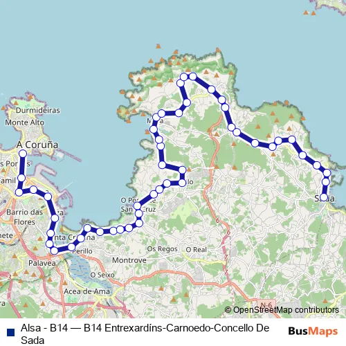The first stop of the Alsa - B14 bus route is Entrexardins and the last stop is Concello De Sada. Alsa - B14 (B14 Entrexardíns-Carnoedo-Concello De Sada) is operational during cada dia.