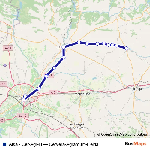 The first stop of the Alsa - Cer-Agr-Ll bus route is Agramunt and the last stop is Lleida. Alsa - Cer-Agr-Ll (Cervera-Agramunt-Lleida) is operational during cada dia.
