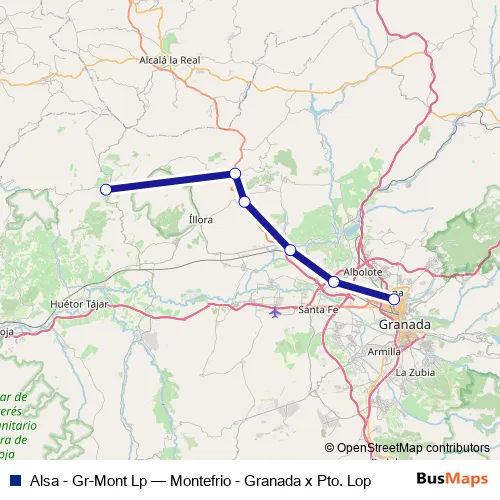 The first stop of the Alsa - Gr-Mont Lp bus route is Montefrio and the last stop is Granada Estación de Autobuses. Alsa - Gr-Mont Lp (Montefrio - Granada x Pto. Lop) is operational during dies feiners.