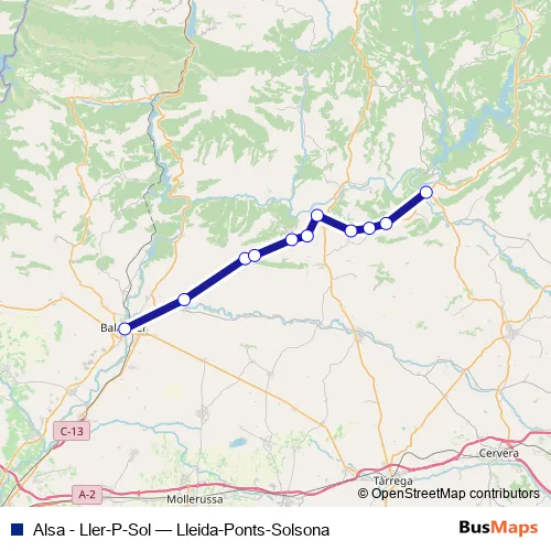 The first stop of the Alsa - Ller-P-Sol bus route is Balaguer and the last stop is Ponts. Alsa - Ller-P-Sol (Lleida-Ponts-Solsona) is operational during dies feiners.