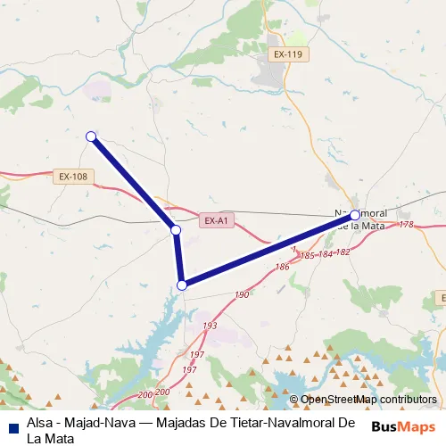 The first stop of the Alsa - Majad-Nava bus route is Majadas Del Tietar and the last stop is Navalmoral De La Mata. Alsa - Majad-Nava (Majadas De Tietar-Navalmoral De La Mata) is operational during dies feiners.