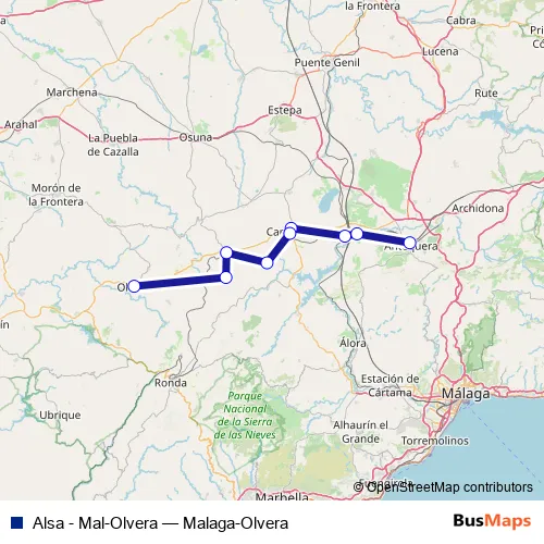 The first stop of the Alsa - Mal-Olvera bus route is Antequera and the last stop is Olvera. Alsa - Mal-Olvera (Malaga-Olvera) is operational during cada dia.