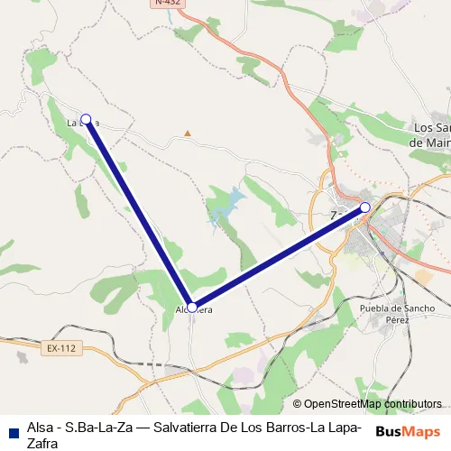 The first stop of the Alsa - S.Ba-La-Za bus route is La Lapa and the last stop is Zafra. Alsa - S.Ba-La-Za (Salvatierra De Los Barros-La Lapa-Zafra) is operational during dies feiners.