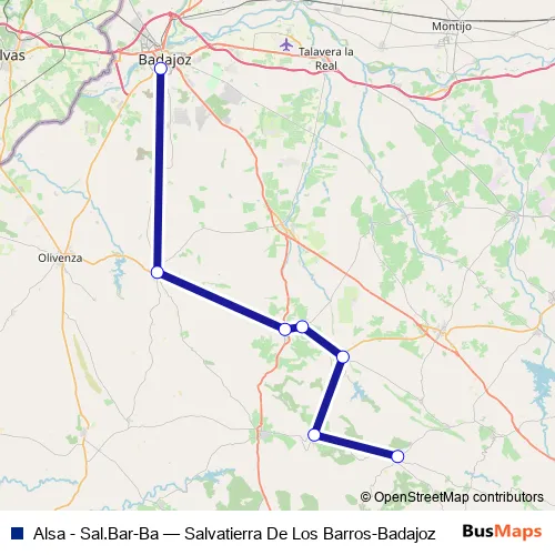 The first stop of the Alsa - Sal.Bar-Ba bus route is Salvatierra De Los Barros and the last stop is Badajoz. Alsa - Sal.Bar-Ba (Salvatierra De Los Barros-Badajoz) is operational during dies feiners.