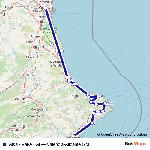 The first stop of the Alsa - Val-Ali Gl bus route is Valencia and the last stop is Benidorm Estación De Autobuses. Alsa - Val-Ali Gl (Valencia-Alicante Gral) is operational during dies feiners.