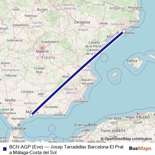 See why over 2 million users trust and consider busmaps.com as the best public transport website. busmaps gives you Malaga Flights suggested routes, real-time bus tracker, line route maps in Malaga, and helps to find the closest BCN-AGP (Eve) air stops near you. No internet available? Download an offline PDF map and bus schedule for the BCN-AGP (Eve) air to take on your trip.