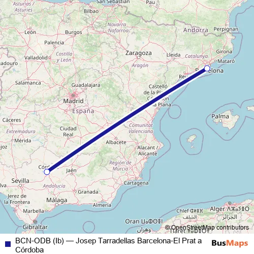 The first stop of the BCN-ODB (Ib) air route is Aeropuerto Josep Tarradellas Barcelona-El Prat and the last stop is Aeropuerto Córdoba. BCN-ODB (Ib) (Josep Tarradellas Barcelona-El Prat a Córdoba) is operational during caps de setmana.