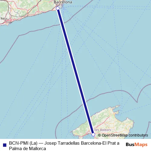 The first stop of the BCN-PMI (La) air route is Aeropuerto Josep Tarradellas Barcelona-El Prat and the last stop is Aeropuerto Palma de Mallorca. BCN-PMI (La) (Josep Tarradellas Barcelona-El Prat a Palma de Mallorca) is operational during cada dia.