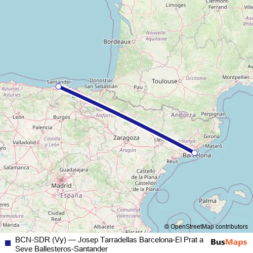 The first stop of the BCN-SDR (Vy) air route is Aeropuerto Josep Tarradellas Barcelona-El Prat and the last stop is Aeropuerto Seve Ballesteros-Santander. BCN-SDR (Vy) (Josep Tarradellas Barcelona-El Prat a Seve Ballesteros-Santander) is operational during cada dia.