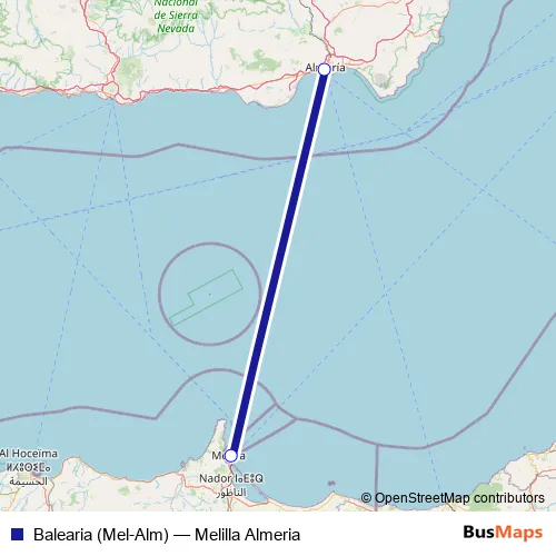 The first stop of the Balearia (Mel-Alm) ferry route is Melilla and the last stop is Almeria. Balearia (Mel-Alm) (Melilla Almeria) is operational during cada dia.