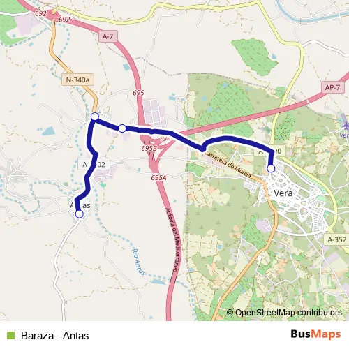 The first stop of the Baraza - Antas bus route is Antas - Centro and the last stop is Vera - Estacion de autobuses. Baraza - Antas (Baraza - Antas) is operational during cada dia.