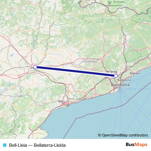 The first stop of the Bell-Lleia bus route is Bellaterra and the last stop is Lleida. Bell-Lleia (Bellaterra-Lleida) is operational during cada dia.