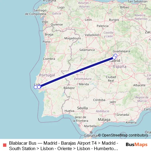 Bus Blablacar Bus - Madrid - Barajas Airport T4 > Madrid - South Station > Lisbon - Oriente > Lisbon - Humberto Delgado Airport > Lisbonne - Sete Rios > Cascais in Lisbon: Stops & Timetable