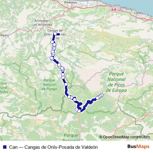 The first stop of the Can bus route is [Posada DE Valdeon] Posada de Valdeón [Cta 07314] and the last stop is [Cangues D'Onís/Cangas DE Onís] Estación Bus Cangas de Onís [Cta 07993]. Can (Cangas de Onís-Posada de Valdeón) is operational during caps de setmana.