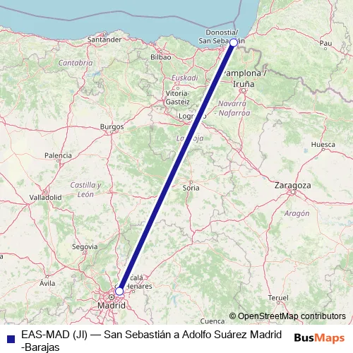 The first stop of the EAS-MAD (Jl) air route is Aeropuerto San Sebastián and the last stop is Aeropuerto Adolfo Suárez Madrid-Barajas. EAS-MAD (Jl) (San Sebastián a Adolfo Suárez Madrid-Barajas) is operational during cada dia.