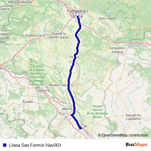 The first stop of the Línea San Fermín Nav003 bus route is Pamplona/Iruña. Estación Bus. Yanguas y Miranda and the last stop is Tudela. Estación Bus. c/ Cuesta Estación. Línea San Fermín Nav003 (Línea San Fermín Nav003) is operational during cada dia.