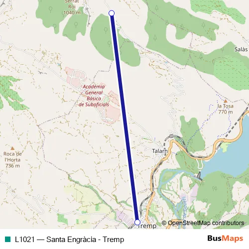 See why over 2 million users trust and consider busmaps.com as the best public transport website. busmaps gives you Tremp Buses suggested routes, real-time bus tracker, line route maps in Tremp, and helps to find the closest L1021 bus stops near you. No internet available? Download an offline PDF map and bus schedule for the L1021 bus to take on your trip.