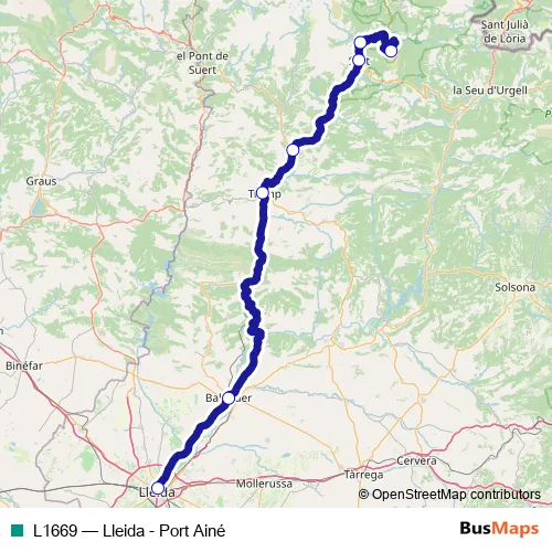 The first stop of the L1669 bus route is Estació d'autobusos de Lleida and the last stop is Port Ainé (estació d'esquí). L1669 (Lleida - Port Ainé) is operational during caps de setmana.