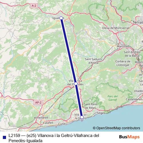 The first stop of the L2159 bus route is Vilanova i la Geltrú (estació d'autobusos) and the last stop is Igualada (estació d'autobusos) Pnl. L2159 ((e25) Vilanova i la Geltrú-Vilafranca del Penedès-Igualada) is operational during dies feiners.