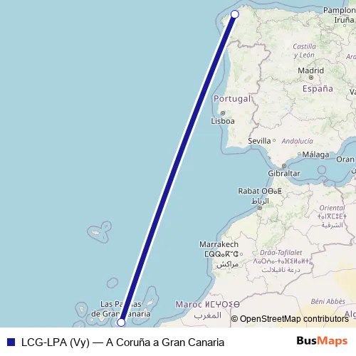 The first stop of the LCG-LPA (Vy) air route is Aeropuerto A Coruña and the last stop is Aeropuerto Gran Canaria. LCG-LPA (Vy) (A Coruña a Gran Canaria) is operational during caps de setmana.