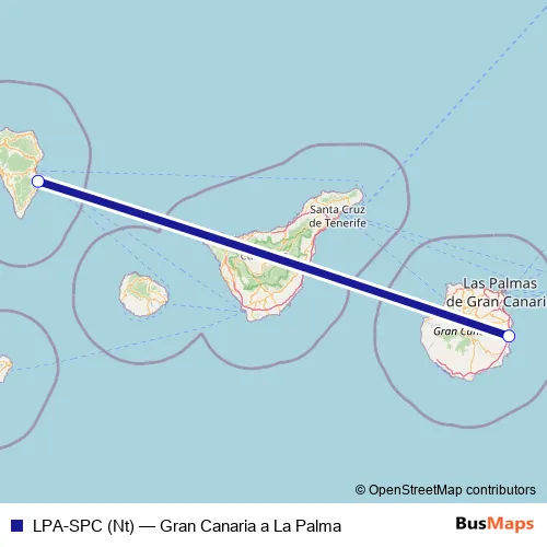 The first stop of the LPA-SPC (Nt) air route is Aeropuerto Gran Canaria and the last stop is Aeropuerto La Palma. LPA-SPC (Nt) (Gran Canaria a La Palma) is operational during cada dia.