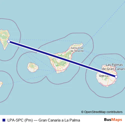 The first stop of the LPA-SPC (Pm) air route is Aeropuerto Gran Canaria and the last stop is Aeropuerto La Palma. LPA-SPC (Pm) (Gran Canaria a La Palma) is operational during cada dia.