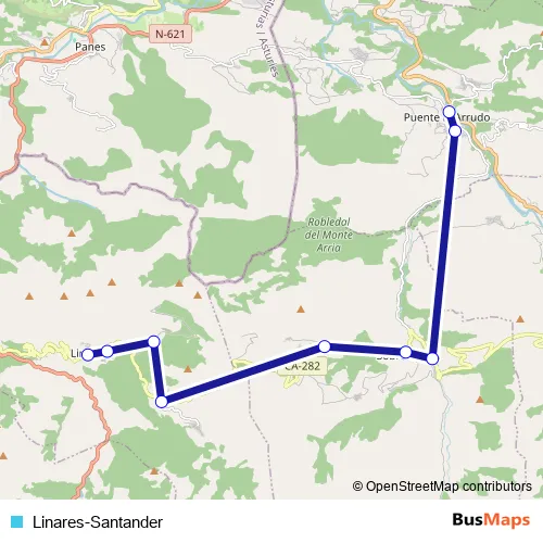 The first stop of the Linares-Santander bus route is Linares Cruce (Linares) and the last stop is Pte.Arrudo (Puente del Arrudo). Linares-Santander (Linares-Santander) is operational during dies feiners.