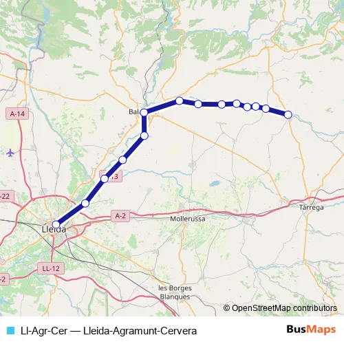 The first stop of the Ll-Agr-Cer bus route is Lleida and the last stop is Agramunt. Ll-Agr-Cer (Lleida-Agramunt-Cervera) is operational during cada dia.