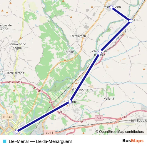 The first stop of the Llei-Menar bus route is Lleida and the last stop is Menarguens. Llei-Menar (Lleida-Menarguens) is operational during cada dia.