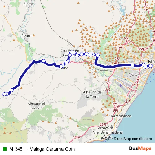 The first stop of the M-345 bus route is Estación De Autobuses De Málaga and the last stop is Coín. M-345 (Málaga-Cártama-Coín) is operational during dies feiners.