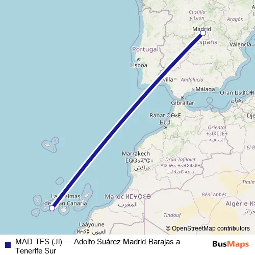 The first stop of the MAD-TFS (Jl) air route is Aeropuerto Adolfo Suárez Madrid-Barajas and the last stop is Aeropuerto Tenerife Sur. MAD-TFS (Jl) (Adolfo Suárez Madrid-Barajas a Tenerife Sur) is operational during caps de setmana.