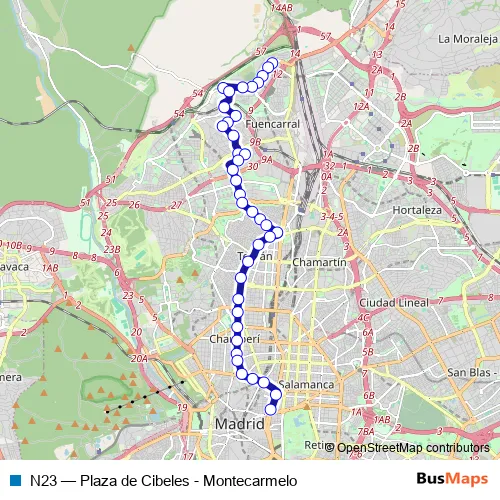 The first stop of the N23 bus route is Montecarmelo and the last stop is Cibeles. N23 (Plaza de Cibeles - Montecarmelo) is operational during cada dia.