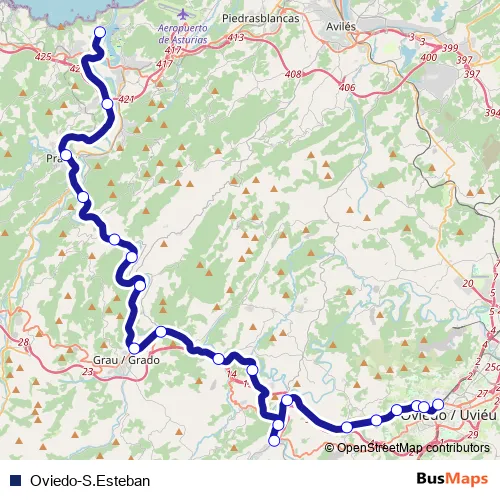 The first stop of the Oviedo-S.Esteban rail route is San Esteban and the last stop is Oviedo. Oviedo-S.Esteban (Oviedo-S.Esteban) is operational during cada dia.