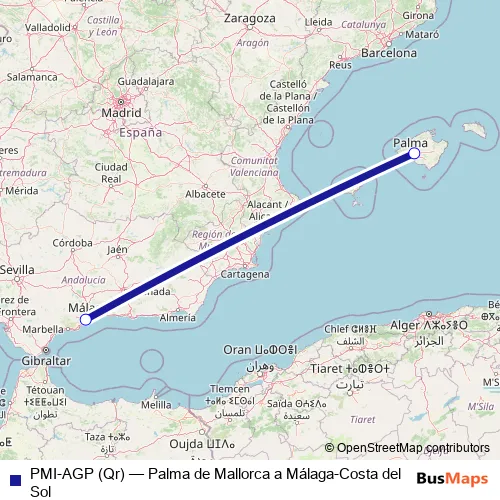 The first stop of the PMI-AGP (Qr) air route is Aeropuerto Palma de Mallorca and the last stop is Aeropuerto Málaga-Costa del Sol. PMI-AGP (Qr) (Palma de Mallorca a Málaga-Costa del Sol) is operational during caps de setmana.