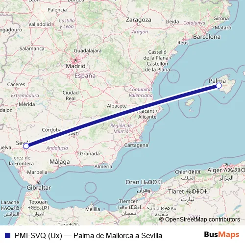 The first stop of the PMI-SVQ (Ux) air route is Aeropuerto Palma de Mallorca and the last stop is Aeropuerto Sevilla. PMI-SVQ (Ux) (Palma de Mallorca a Sevilla) is operational during cada dia.