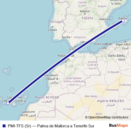 The first stop of the PMI-TFS (Sr) air route is Aeropuerto Palma de Mallorca and the last stop is Aeropuerto Tenerife Sur. PMI-TFS (Sr) (Palma de Mallorca a Tenerife Sur) is operational during cada dia.