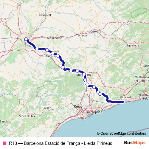 The first stop of the R13 rail route is Lleida Pirineus and the last stop is Vilabella. R13 (Barcelona Estació de França - Lleida Pirineus) is operational during cada dia.