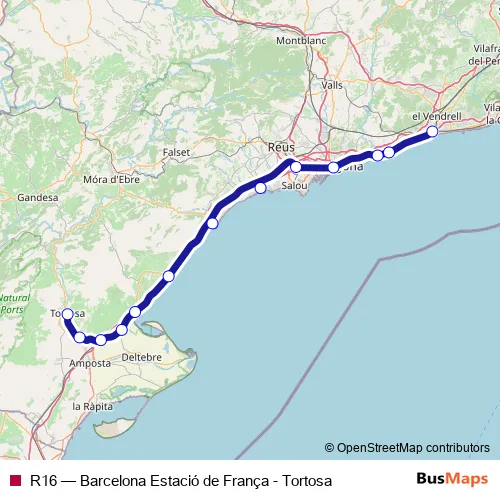 The first stop of the R16 rail route is Sant Vicenç de Calders and the last stop is Tortosa. R16 (Barcelona Estació de França - Tortosa) is operational during cada dia.