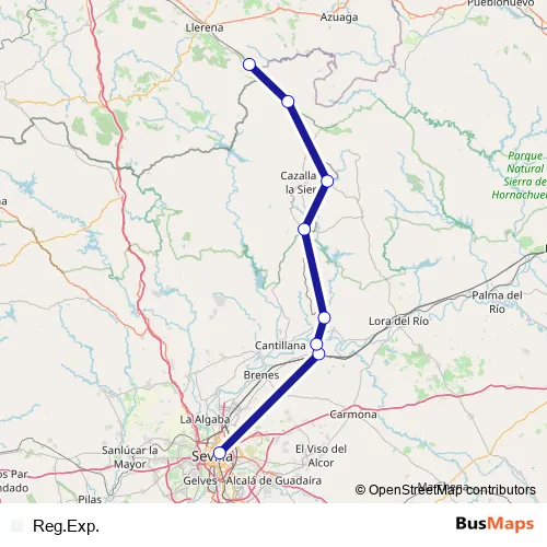 The first stop of the Reg.Exp. rail route is Sevilla-Santa Justa and the last stop is Fuente Del Arco. Reg.Exp. is operational during cada dia.