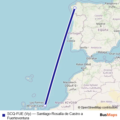 The first stop of the SCQ-FUE (Vy) air route is Aeropuerto Santiago-Rosalía de Castro and the last stop is Aeropuerto Fuerteventura. SCQ-FUE (Vy) (Santiago-Rosalía de Castro a Fuerteventura) is operational during cada dia.