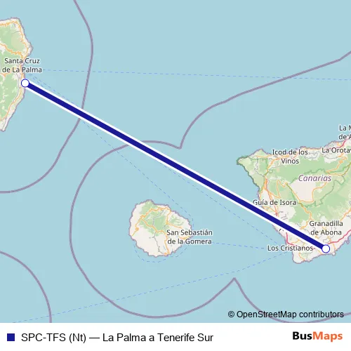 The first stop of the SPC-TFS (Nt) air route is Aeropuerto La Palma and the last stop is Aeropuerto Tenerife Sur. SPC-TFS (Nt) (La Palma a Tenerife Sur) is operational during cada dia.